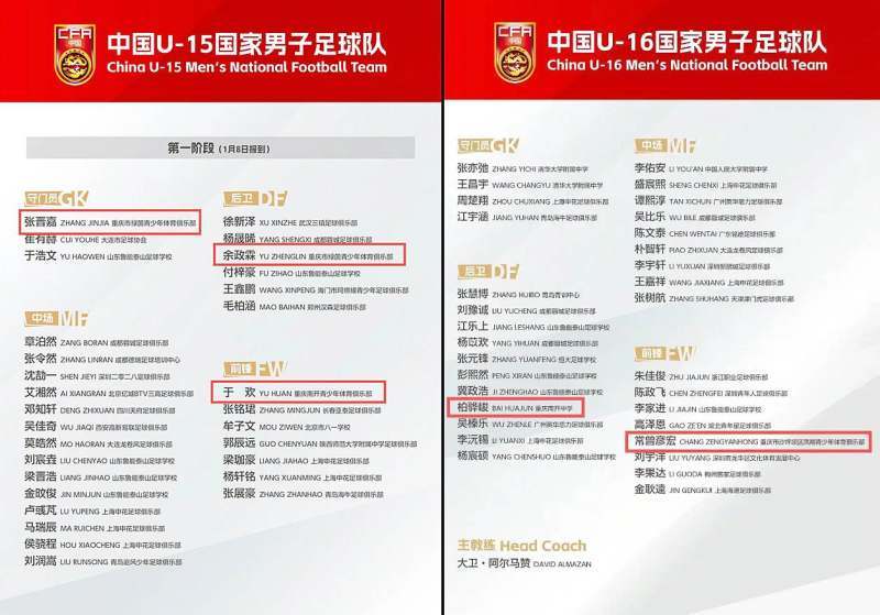 入选U15国家队的张晋嘉和余政霖来自市足管中心和西大附中合作共建的2011年龄段精英梯队,他们的教练是曾经效力于重庆FC俱乐部的郭明月。郭明月表示:“张晋嘉司职守门员,余政霖司职后卫,他们曾和于欢一起参加西安国际青少年足球交流赛,并随队夺得冠军,希望他们能在U15国家队有出色的发挥。”
